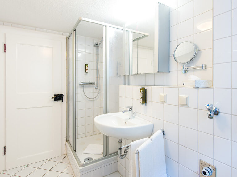 separates Badezimmer, Dusche, Föhn und Kosmetikspiegel