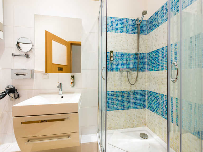 separates Badezimmer mit Dusche, Föhn und Kosmetikspiegel